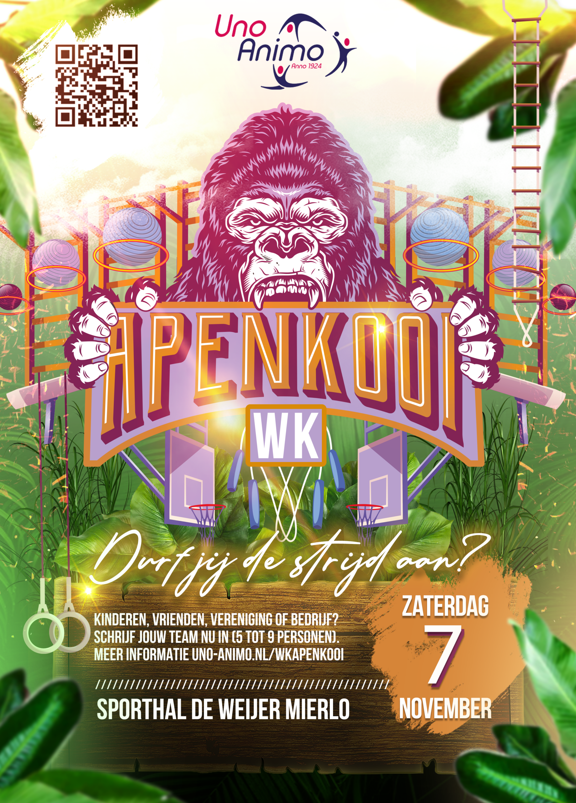 Op zaterdag 7 november 2026 organiseert Gymnastiekvereniging Uno Animo het WK Apenkooi 2026.